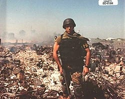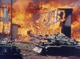 FBI posing for trophy photos with the smoldering remains of 76 people in the background who were burned alive by the benevolent government, including innocent women and 26 children. Five of the children also had bullet wounds.